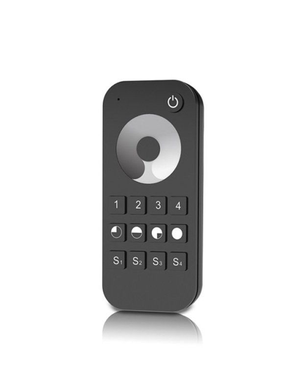 Nuotolinio valdymo RF pultelis LED juostų valdymui, vienos spalvos ryškumui nustatyti, 2.4GHz, 4 zonų, su sensoriniu ratuku, palaiko 4 scenarijų, 10 apšvietimo lygių valdymą.